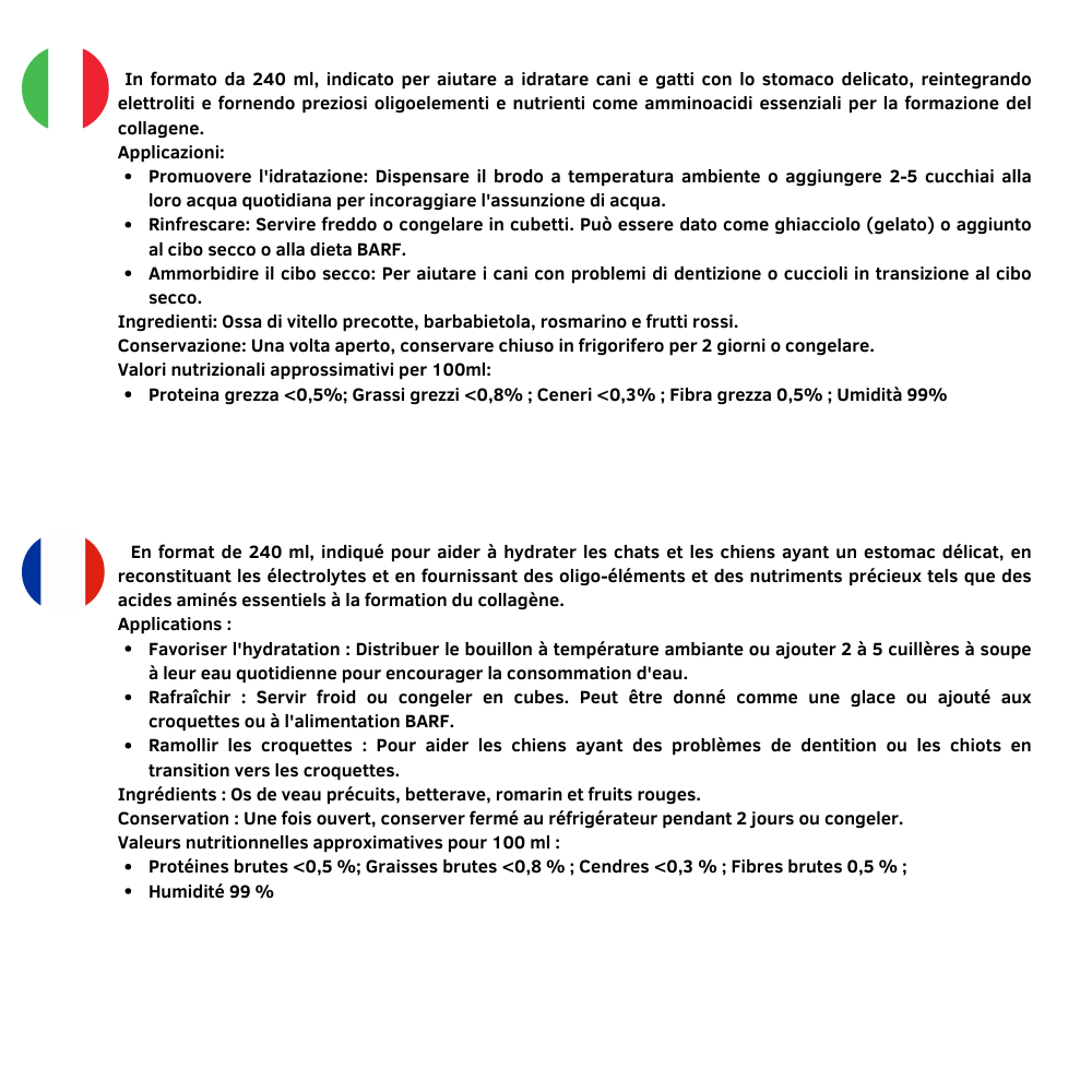 Le daikidoggy est un bouillon à base de veau, de betterave, de romarin et de fruits rouges pour aider à l'hydratation des chiens et des chats, en reconstituant les électrolytes et en fournissant des oligo-éléments et des nutriments précieux tels que les acides aminés essentiels à la formation du collagène.